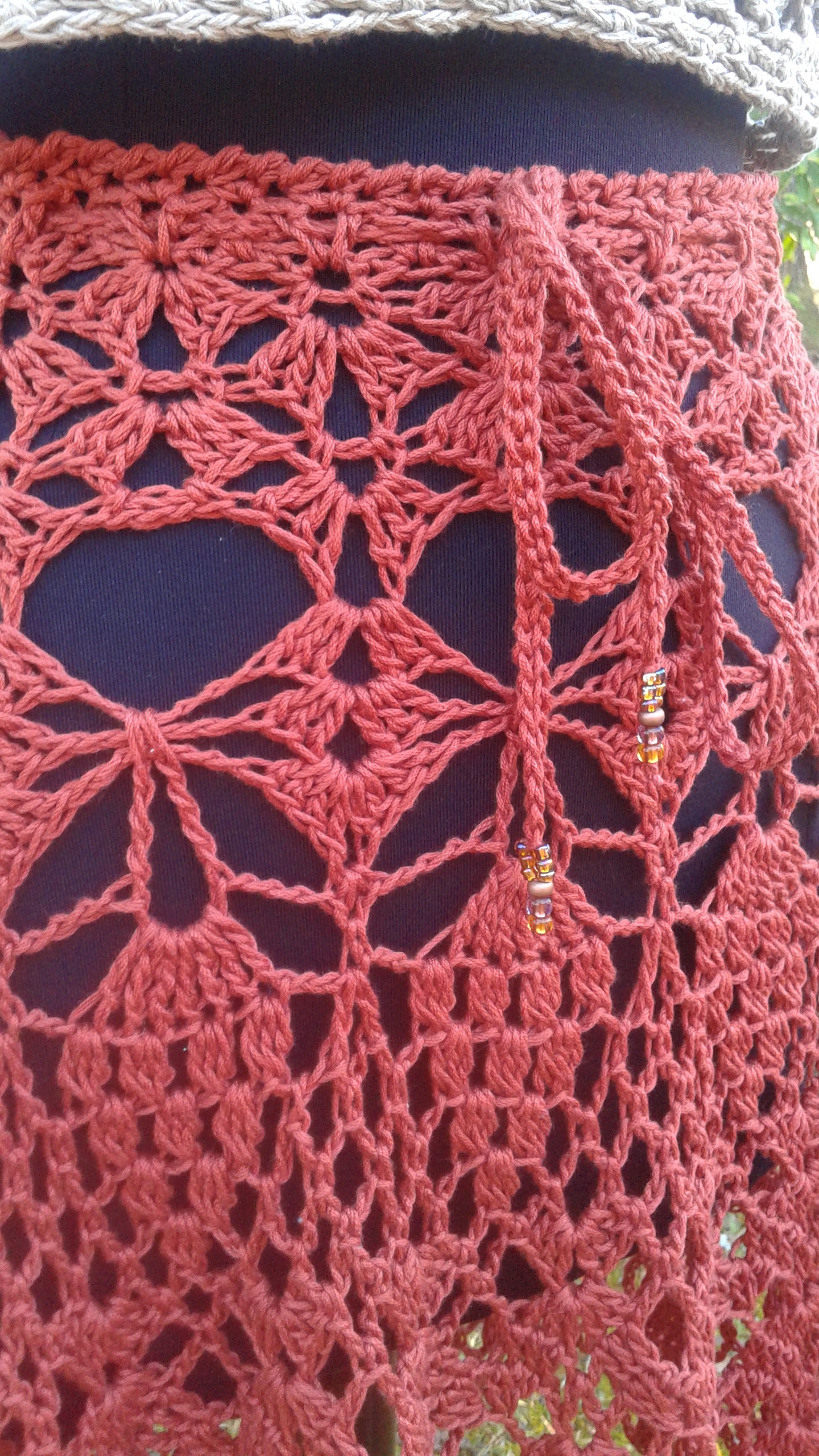 Openwork crochet skirt made with cotton fiber. This skirt is knee-length with a drawstring waistband.